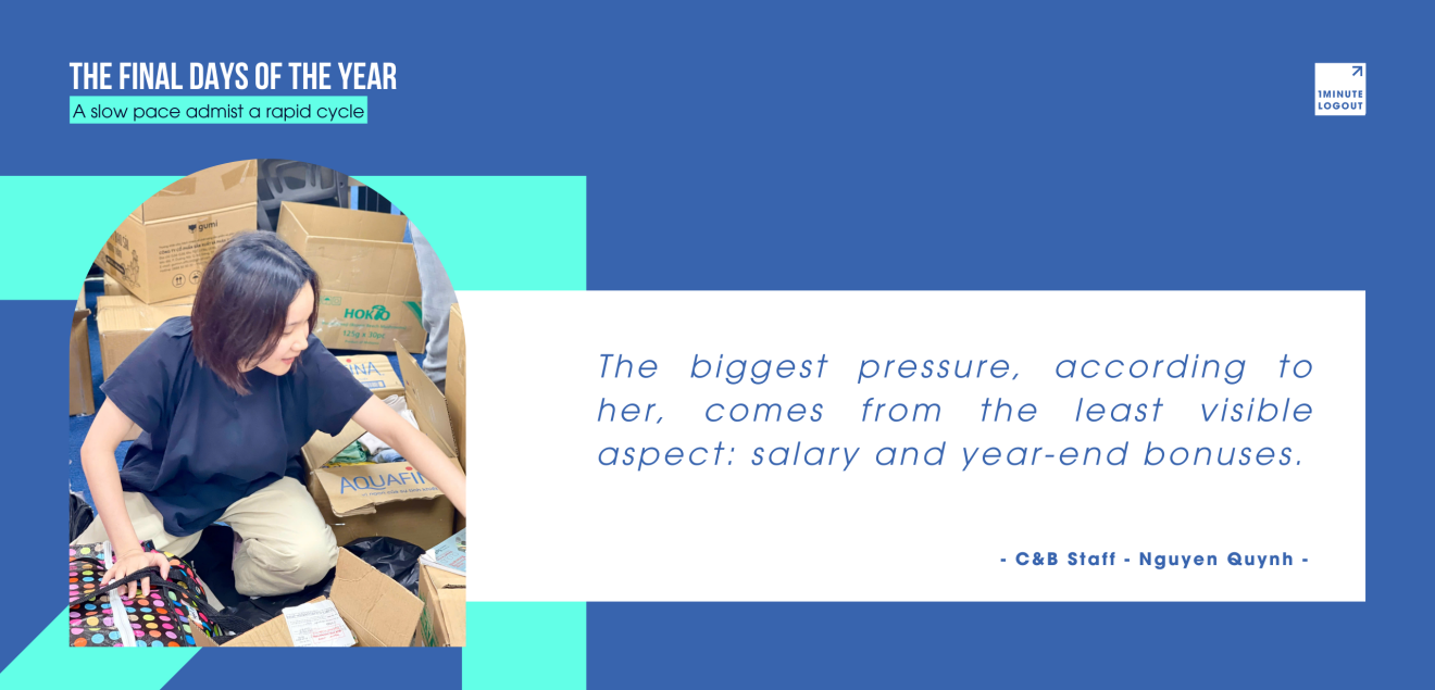In this episode of 1-Minute Logout, we chose to tell a very different story. Instead of focusing on bursts of speed, we explore how one learns to slow down just enough during days that seem incapable of slowing at all. At the center of this story is Ms. Nguyễn Quỳnh, who is handling administrative responsibilities during the busiest period of the year, under a level of pressure far from the “light” workload many might assume.